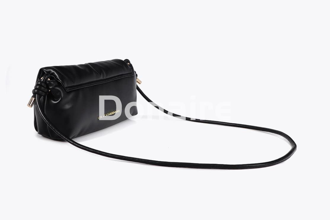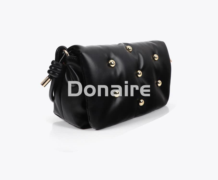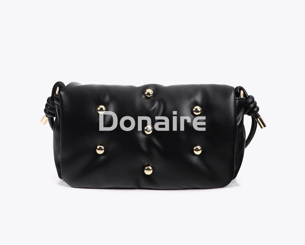 Bandolera acolchada en efecto piel con tachas redondas doradas. Cierre magnético y correa ajustable para mayor comodidad. Logotipo metalizado en parte trasera con un acabado impecable .