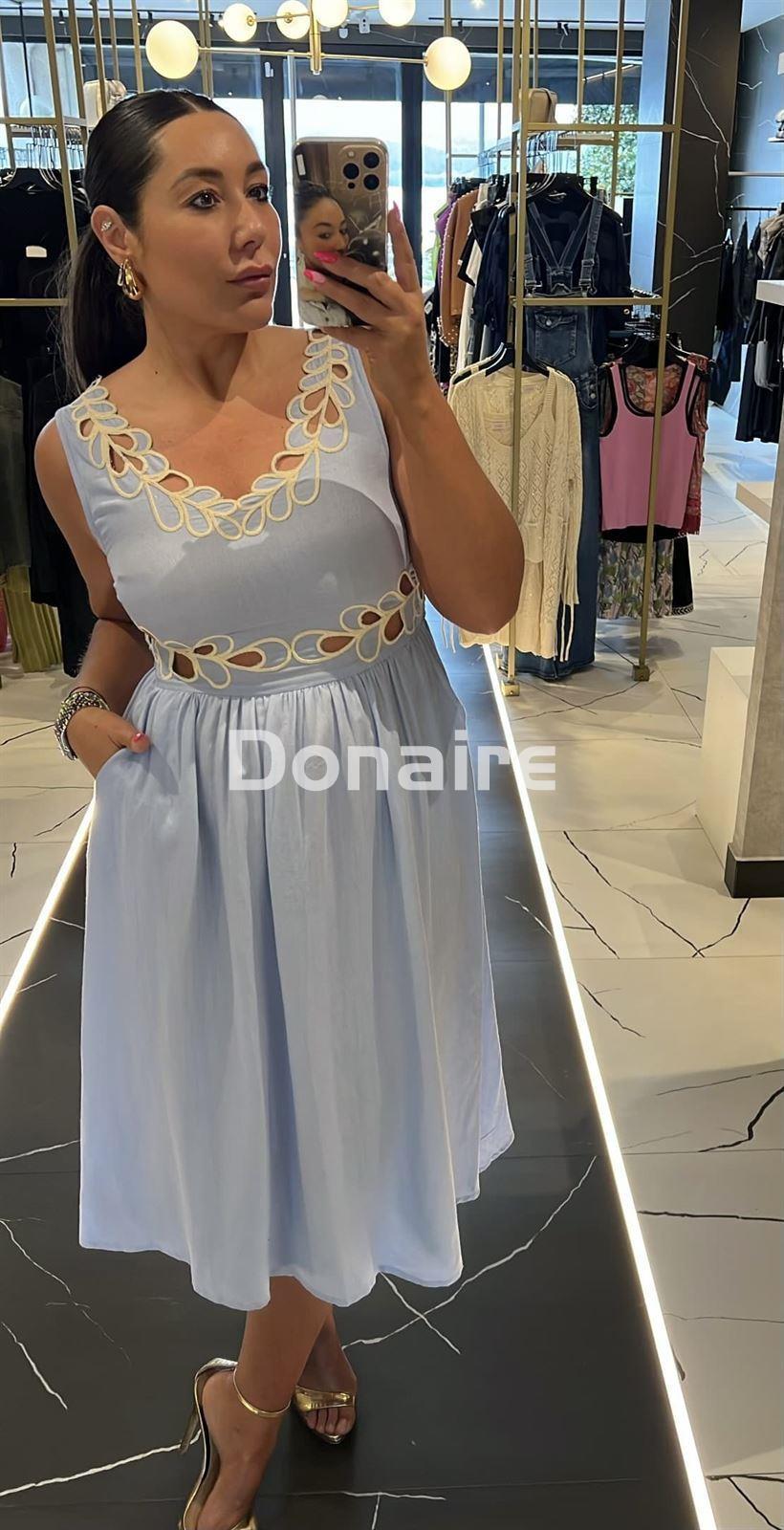Vestido azul manga sisa con corte en cintura y vuelo con bolsillos en falda .Hojas bordadas en parte superior y hojas abiertas para dejar ver la piel.